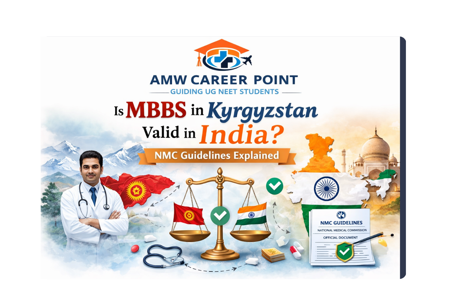 At AMW Career Point, we understand how important it is for students to choose a country and university that meets all regulatory requirements. If you are planning for MBBS in Kyrgyzstan 2026, it is crucial to understand the latest NMC (National Medical Commission) guidelines, eligibility requirements, and licensing procedures in India. This blog provides complete clarity about recognition, validity, and the process to practice in India after completing your medical degree.