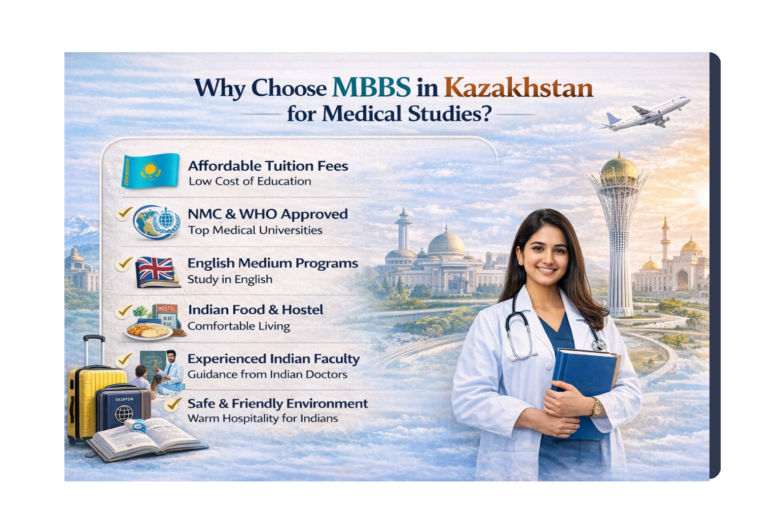 Kazakhstan is a safe and welcoming place for international students. Cities like Almaty and Astana have modern infrastructure, good public transportation, and more and more Indian people living there.